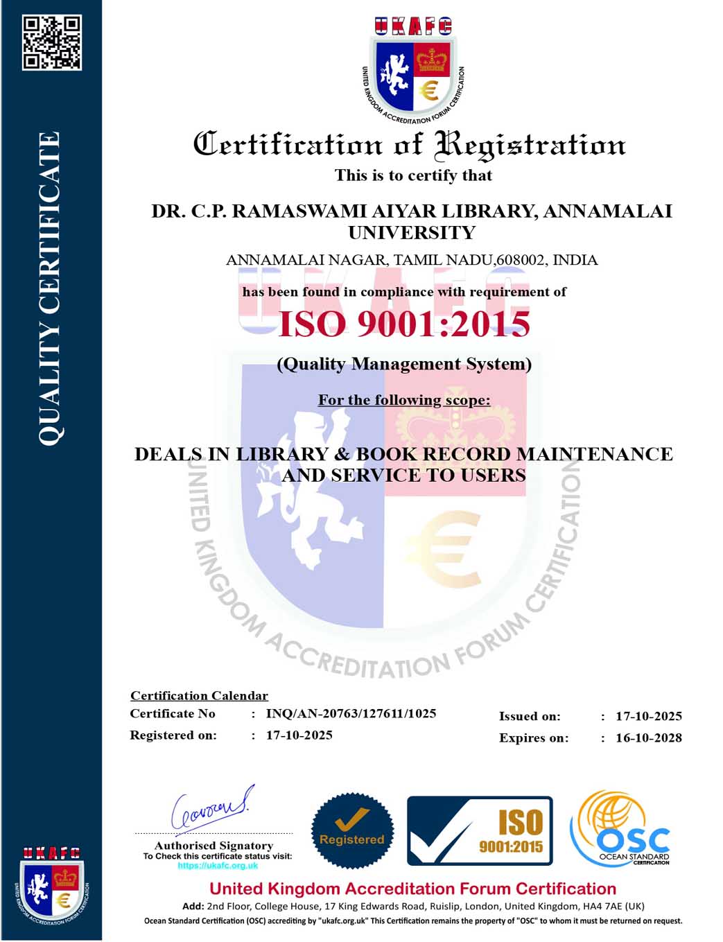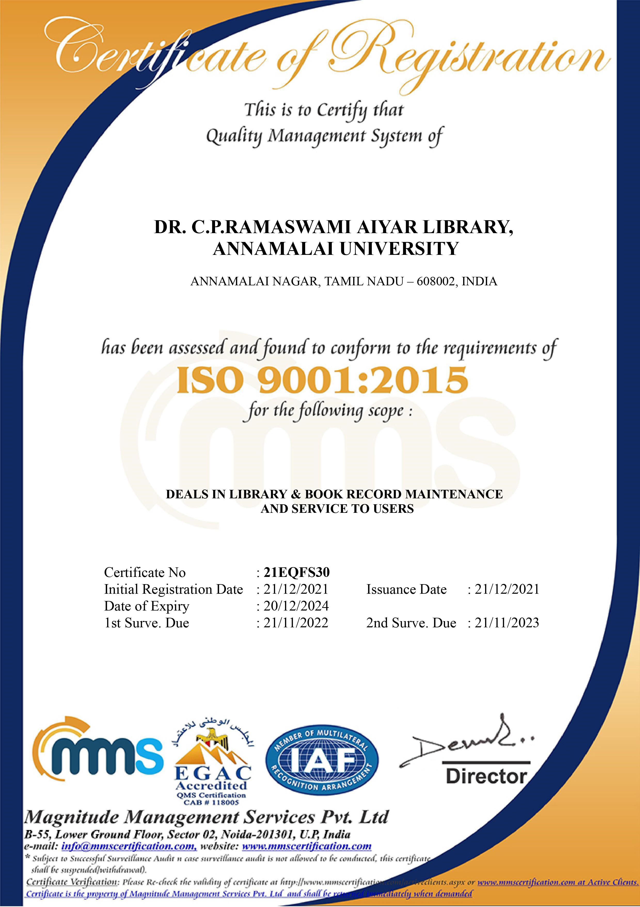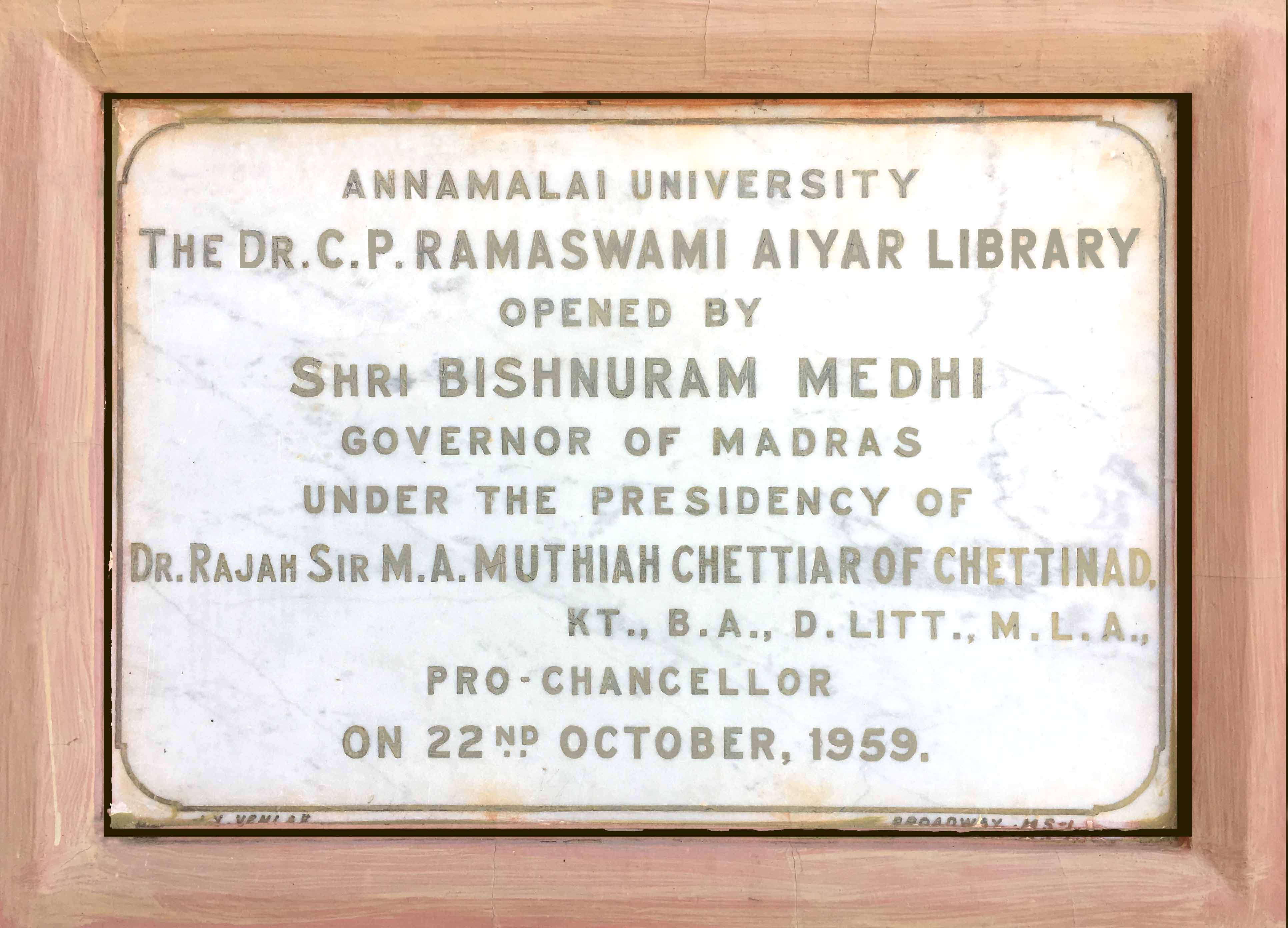 The Unique Heritage building was designed by internationally reputed architects namely Messers. Prynne, Abbot, and Davis and the building was named after the statesman- former Vice Chancellor the eminent scholar of Annamalai University, Dr.Sir C.P.Ramaswamy Aiyar, in recognition of his valuable services to the country and to this University. The present building was opened by His Excellency Shri.Bishnuram Medhi, the then Governor of Madras, on 22nd October, 1959 within a built-in area of about 36,000 sq.ft. The building is a "H" shaped structure, with a well controlled entrance lobby, a spacious Central Reading Hall, Reference Hall, Periodicals Hall, and Bindery on the Eastern wing and Administrative Sections, closed access stack-rooms, Reprographic Section in the western wing and open access stack rooms on both the wings. The access to the Infonet Lab and E-Journals collection are especially for the researchers and staff members who are extended browsing facilities, E-journal access as well.